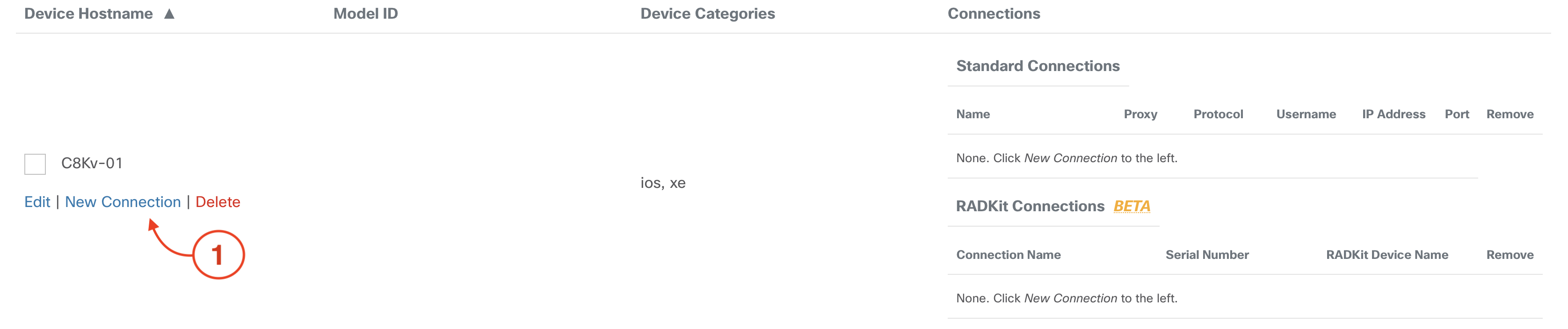 In the Connection Details pop-up, enter the below information to add an ssh connection to the C8Kv-01 device: