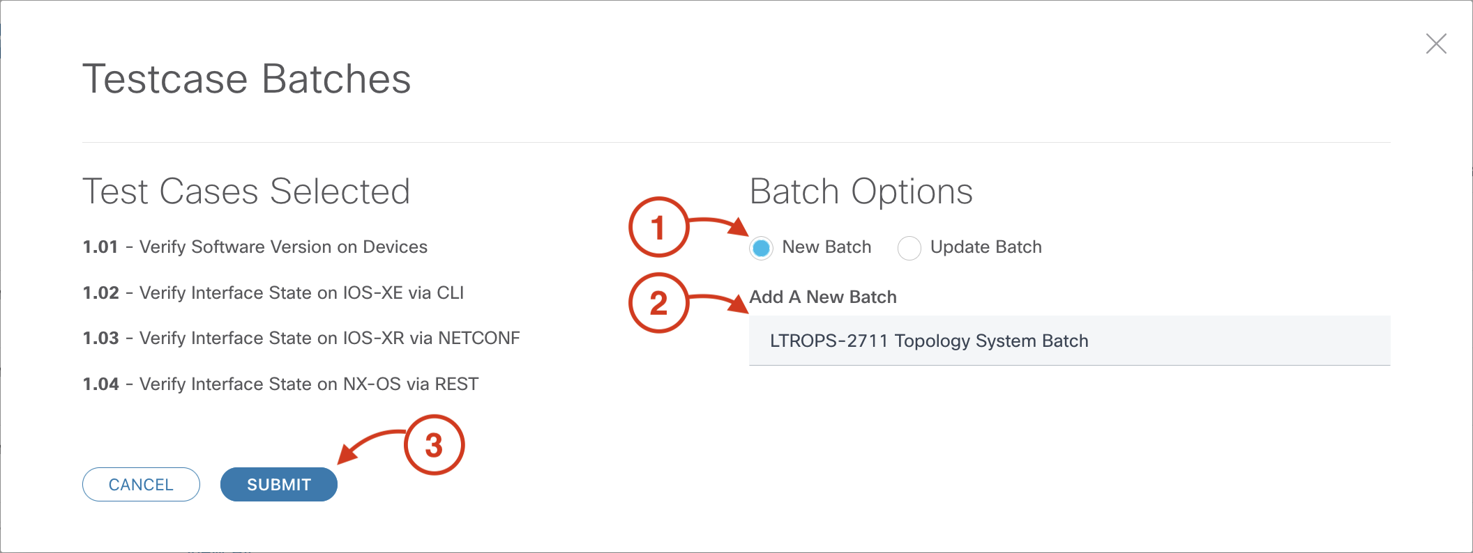 In the Testcase Batches popup, make the following selections: