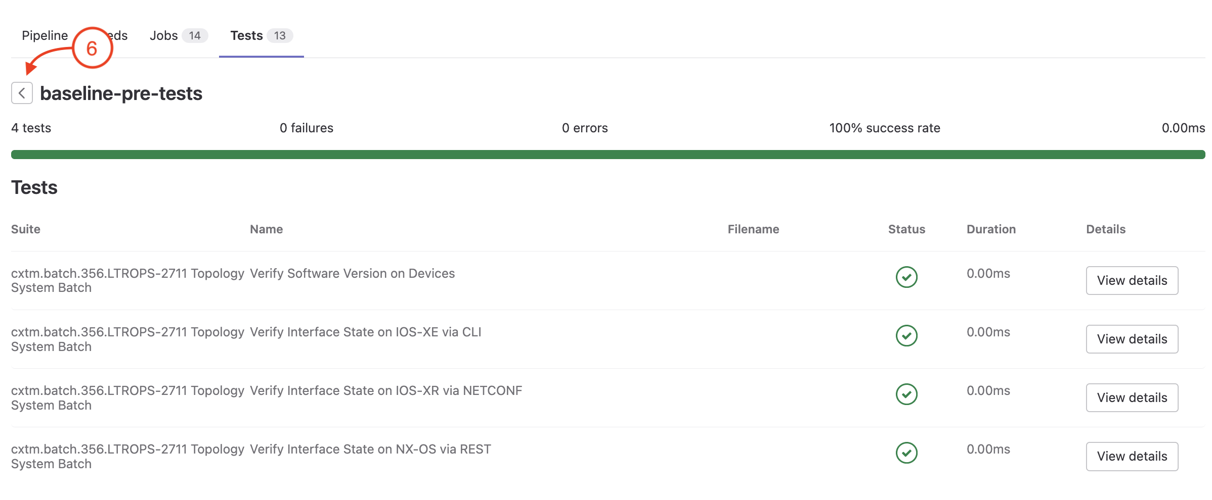 Review test results for the pre-tests stage. Click on the baseline-pre-tests job to view the test results.