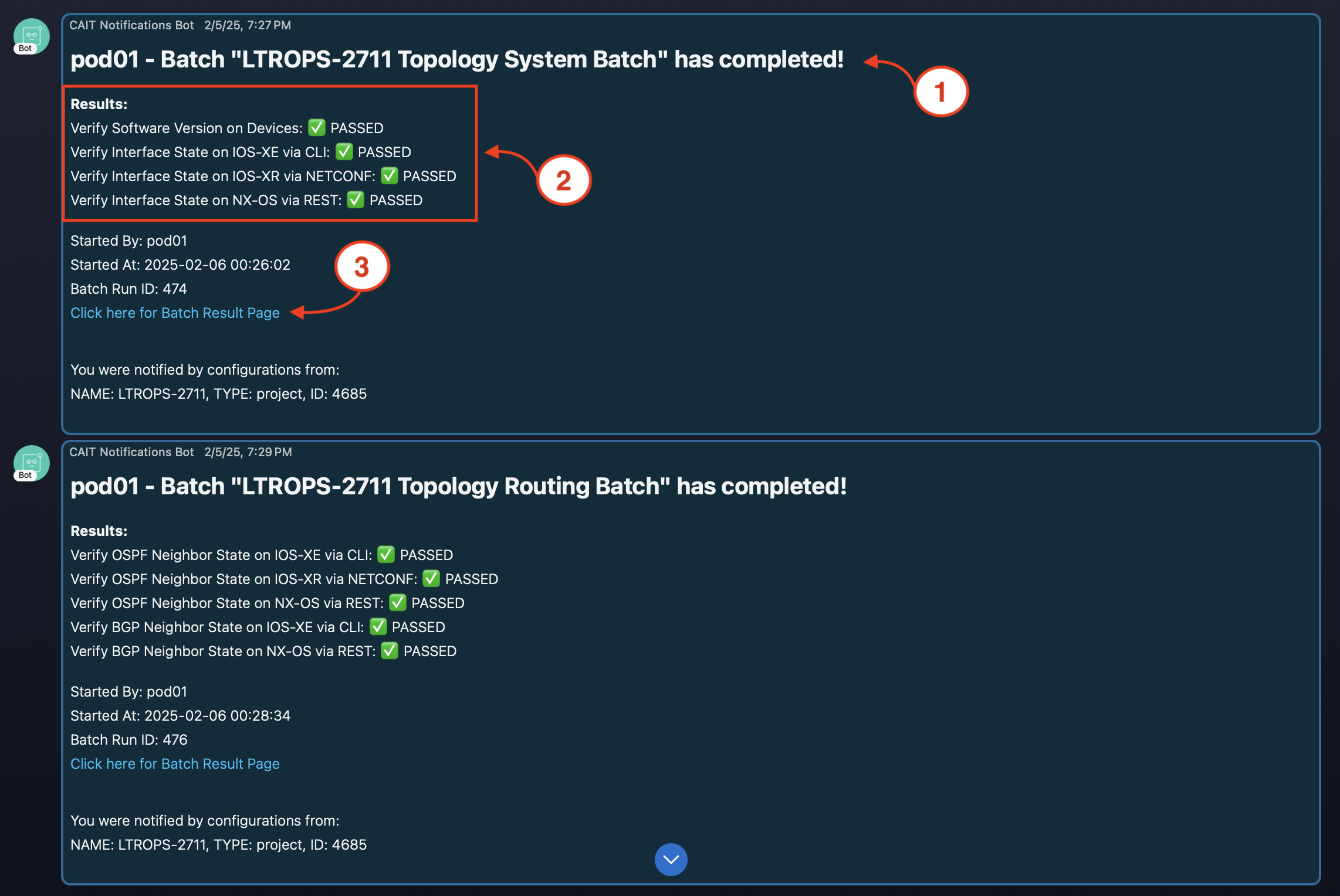 Hopefully you caught the Webex notifications for your pod (pod21) in real time. If not, review the screenshot below for an example of what you would have seen in the Webex space, and take note of the following.