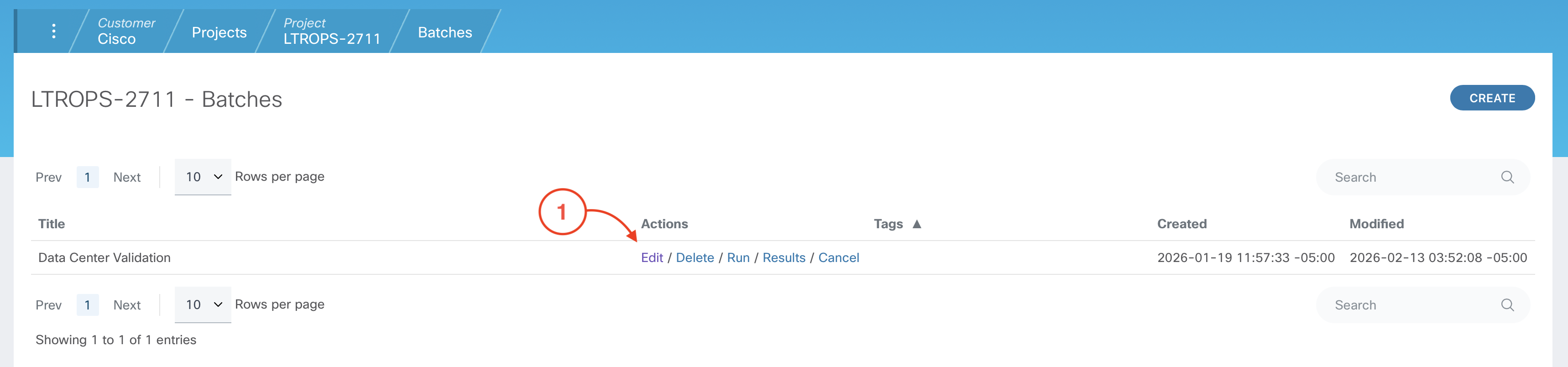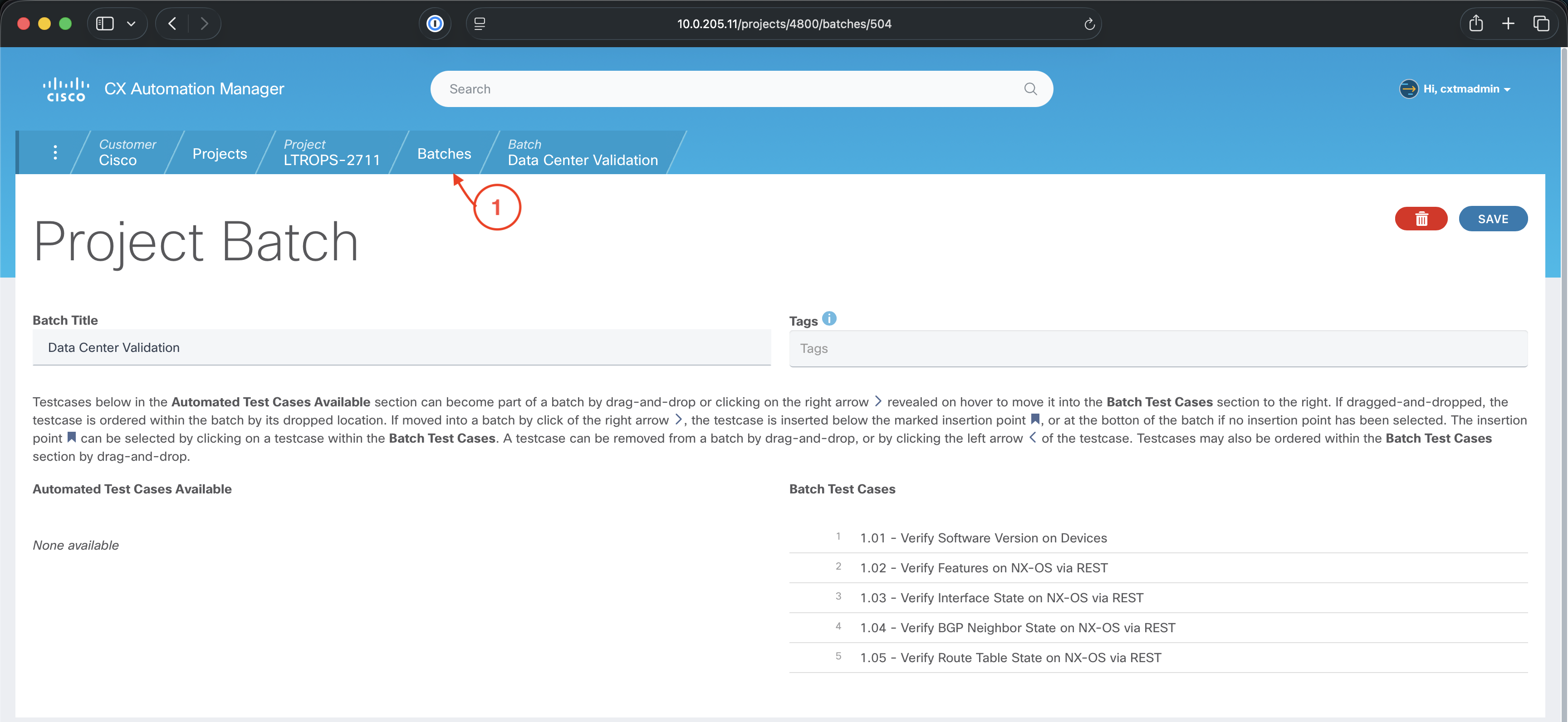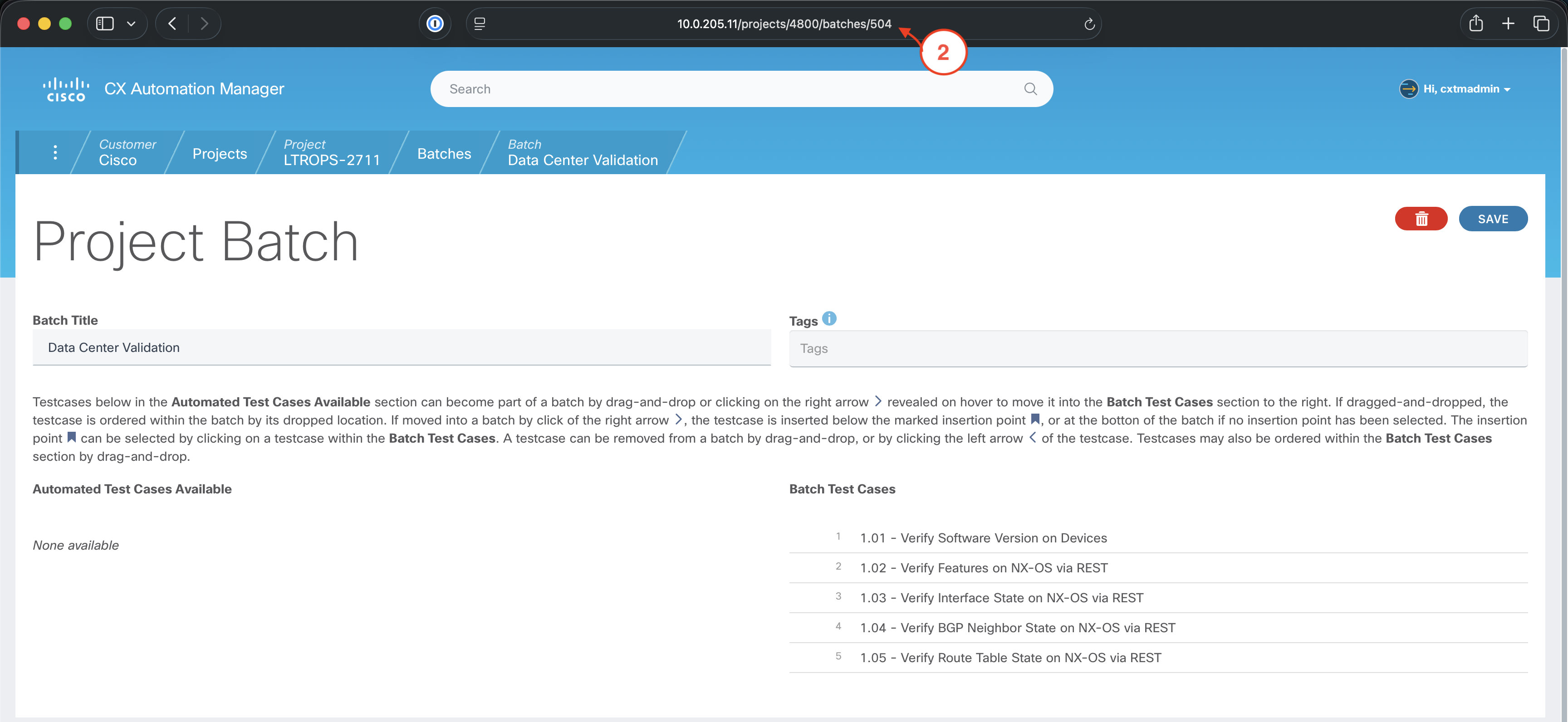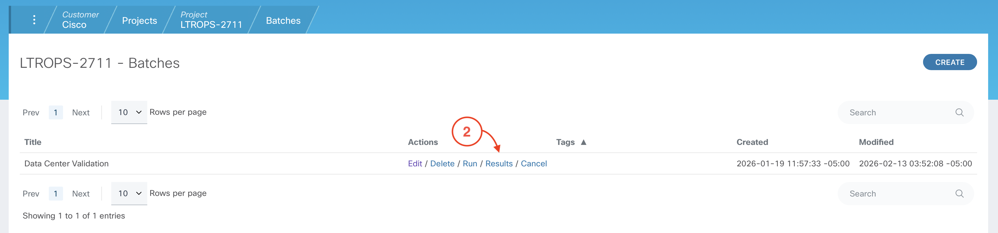 Collect the batch ID for the Data Center Validation directly from the URL ("504" in this example)