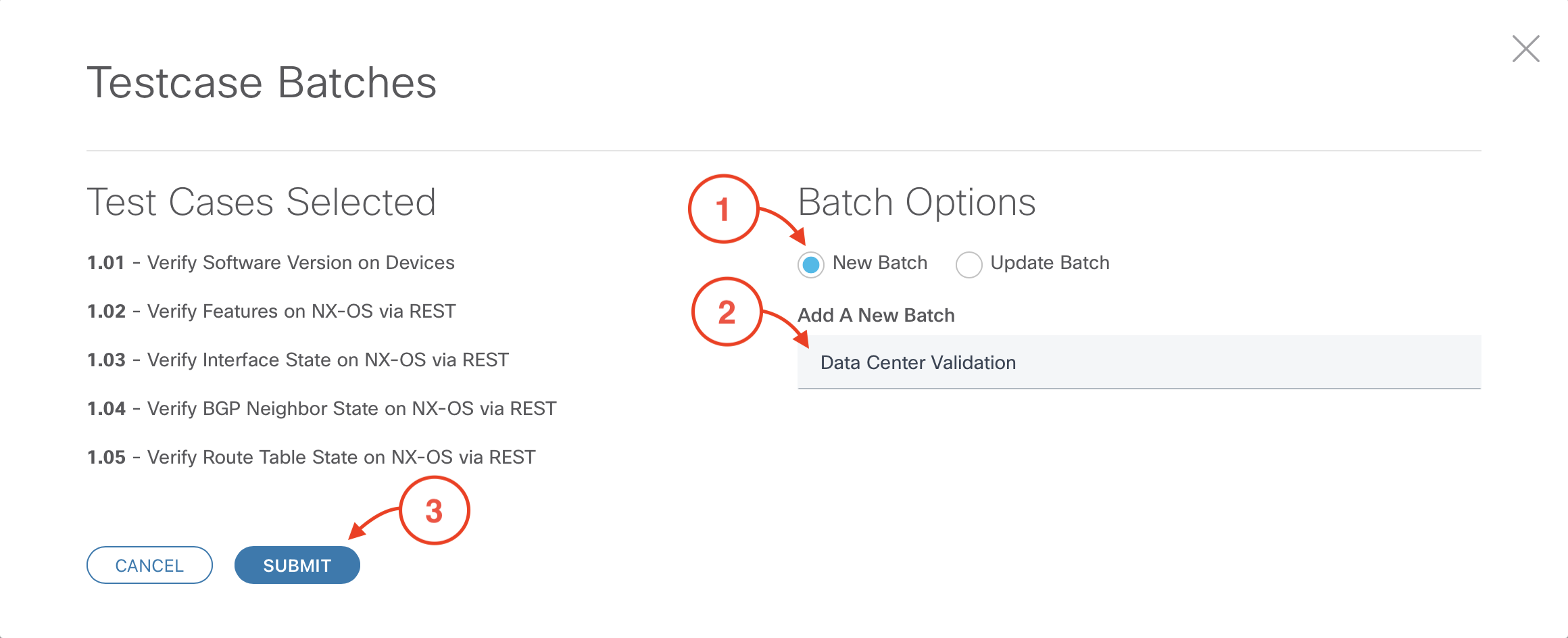 In the Testcase Batches popup, make the following selections: