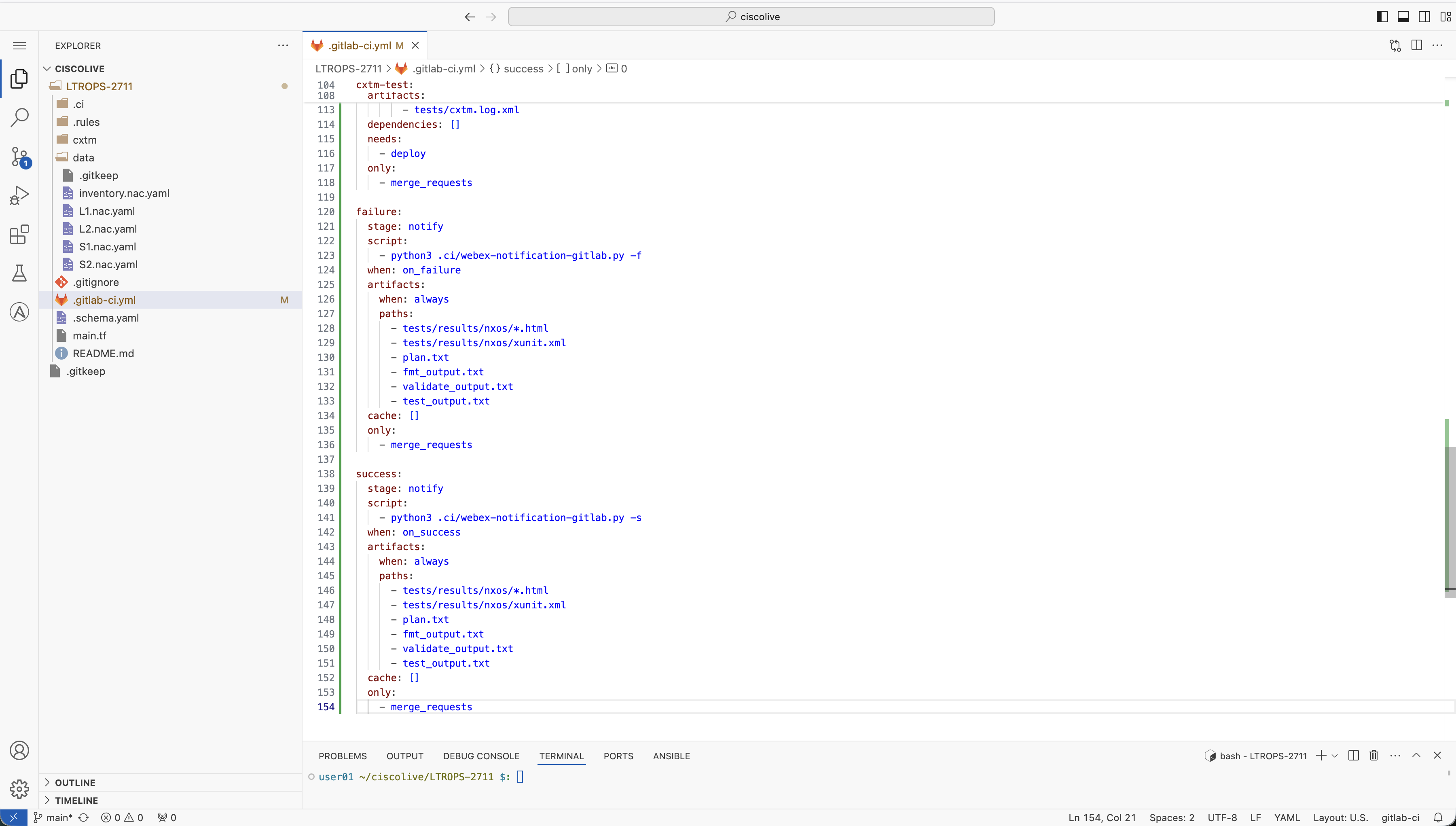 You will now add the notify stage to the stages section of your .gitlab-ci.yml file. This stage will run after the CXTM stage to send Webex notifications about the pipeline execution results.