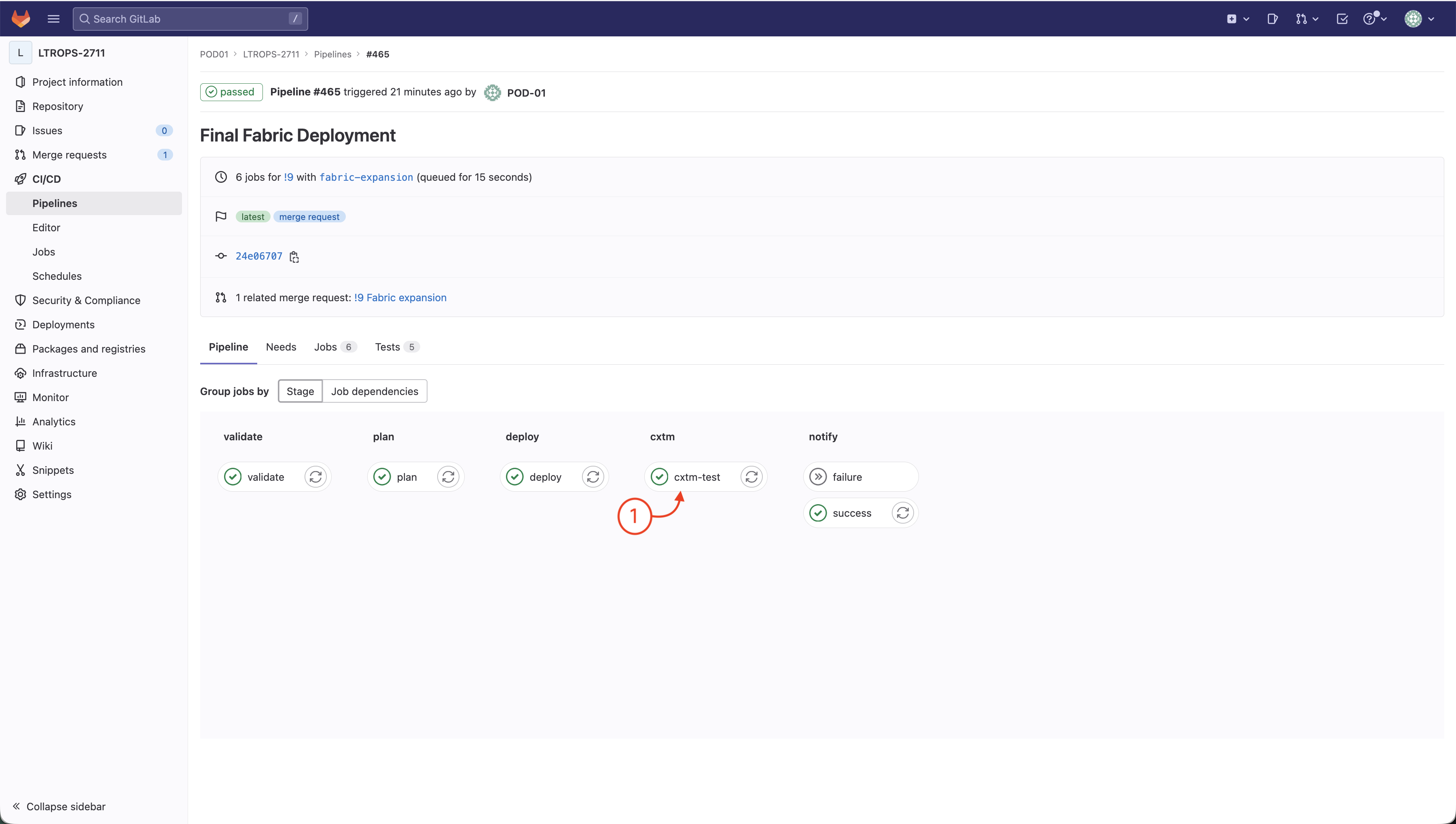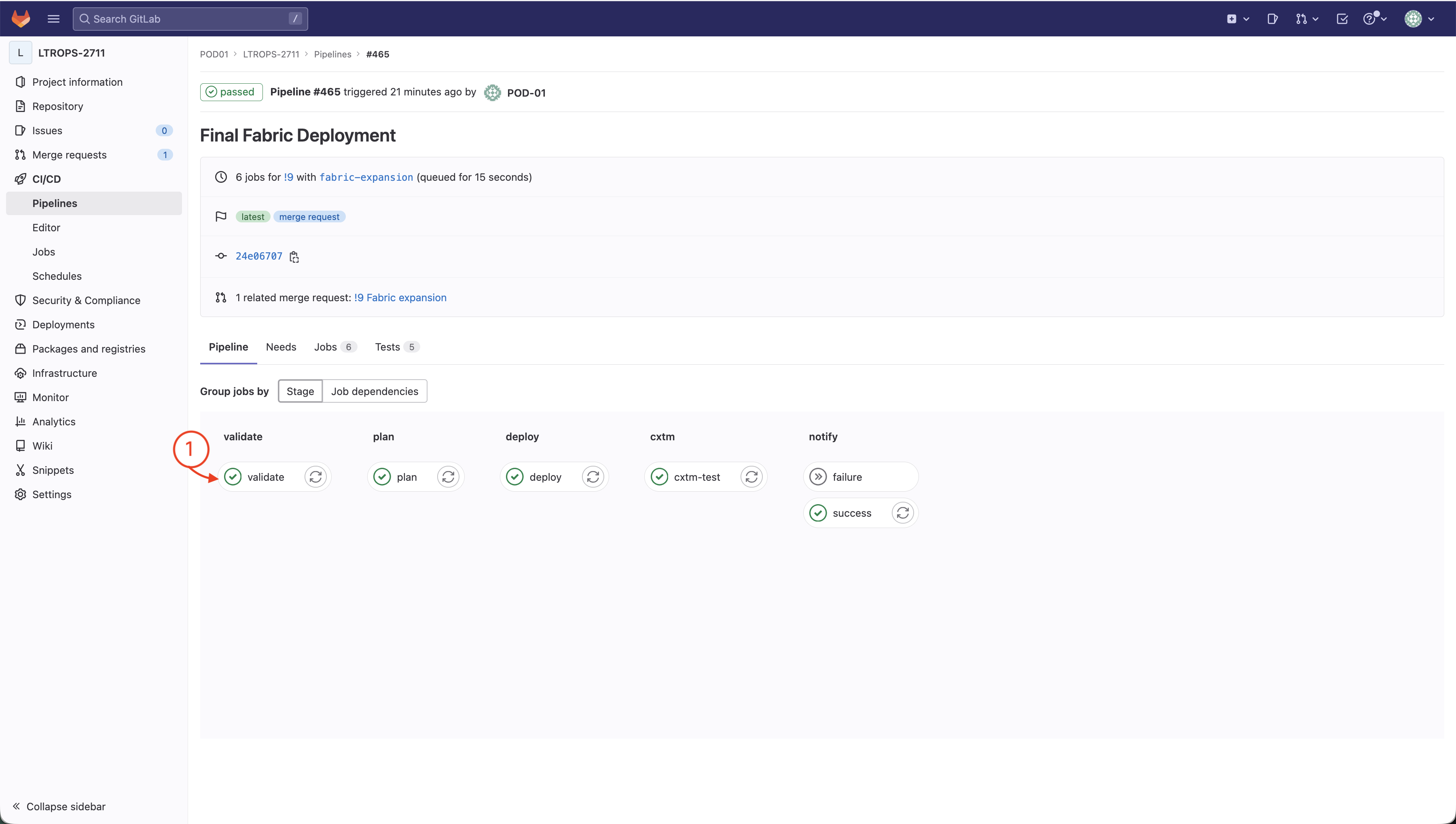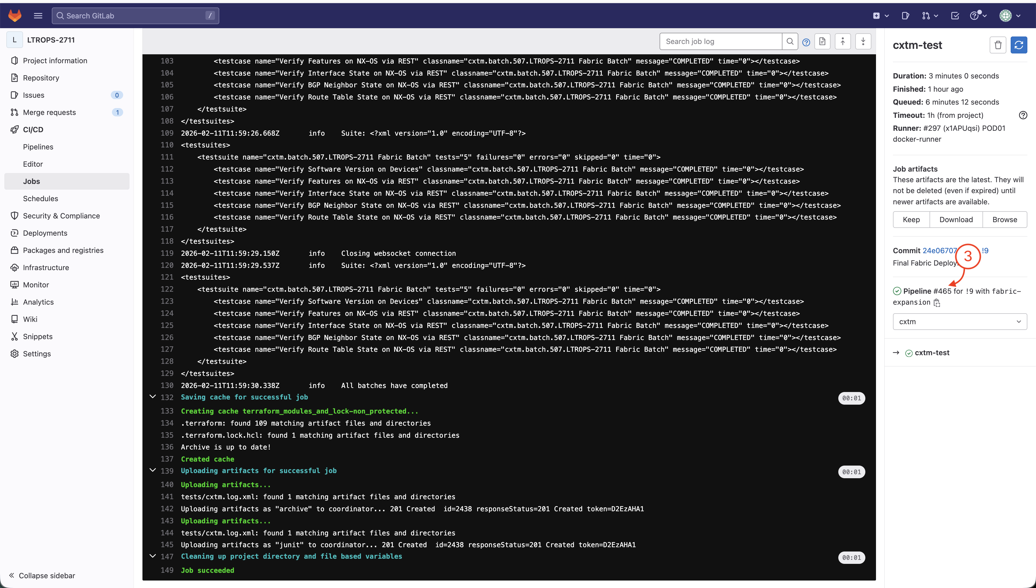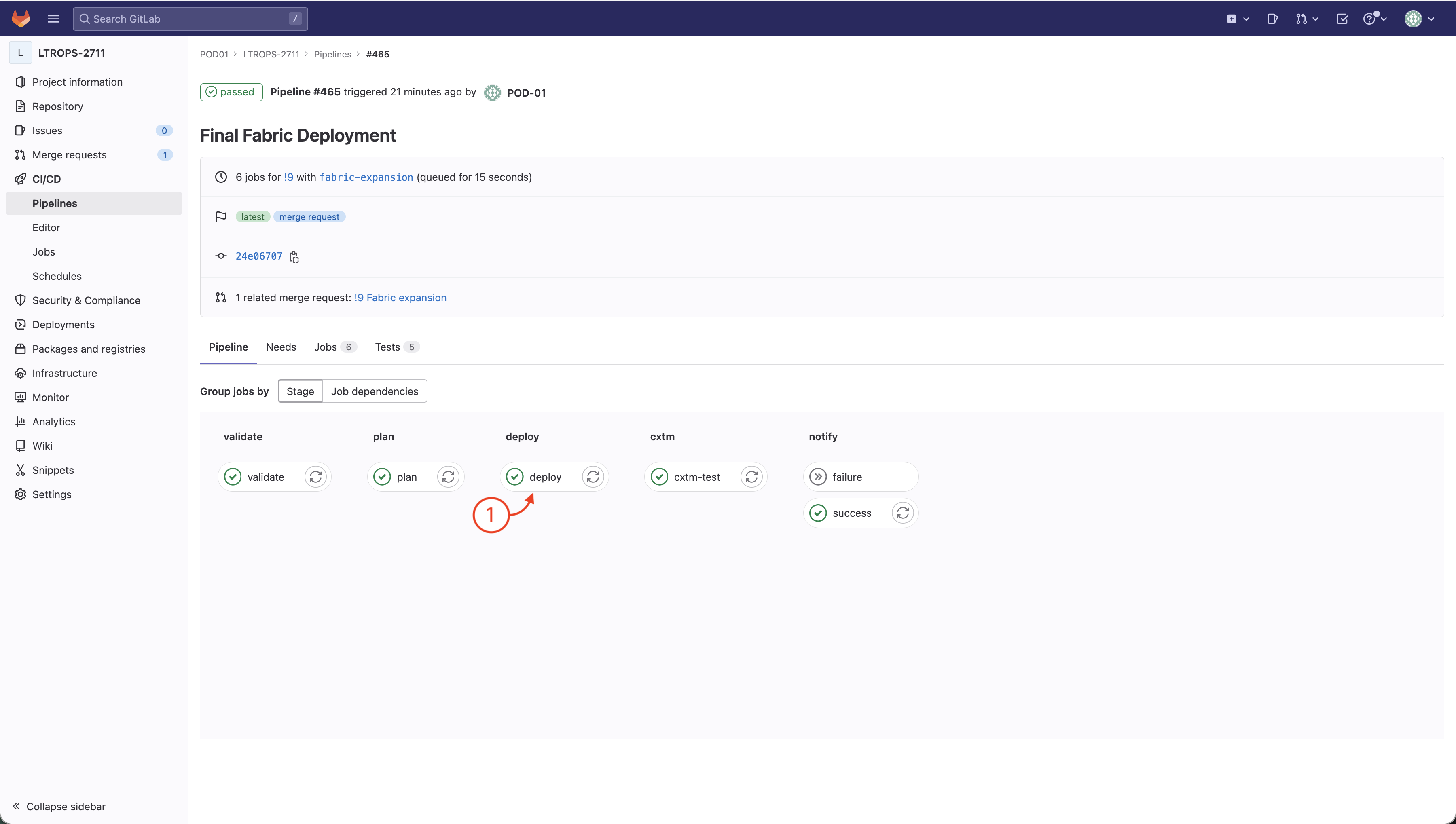 In this section, you will execute the complete GitLab CI/CD pipeline with all stages including validation, planning, deployment, testing, and notifications to deploy the expanded Nexus fabric configuration.