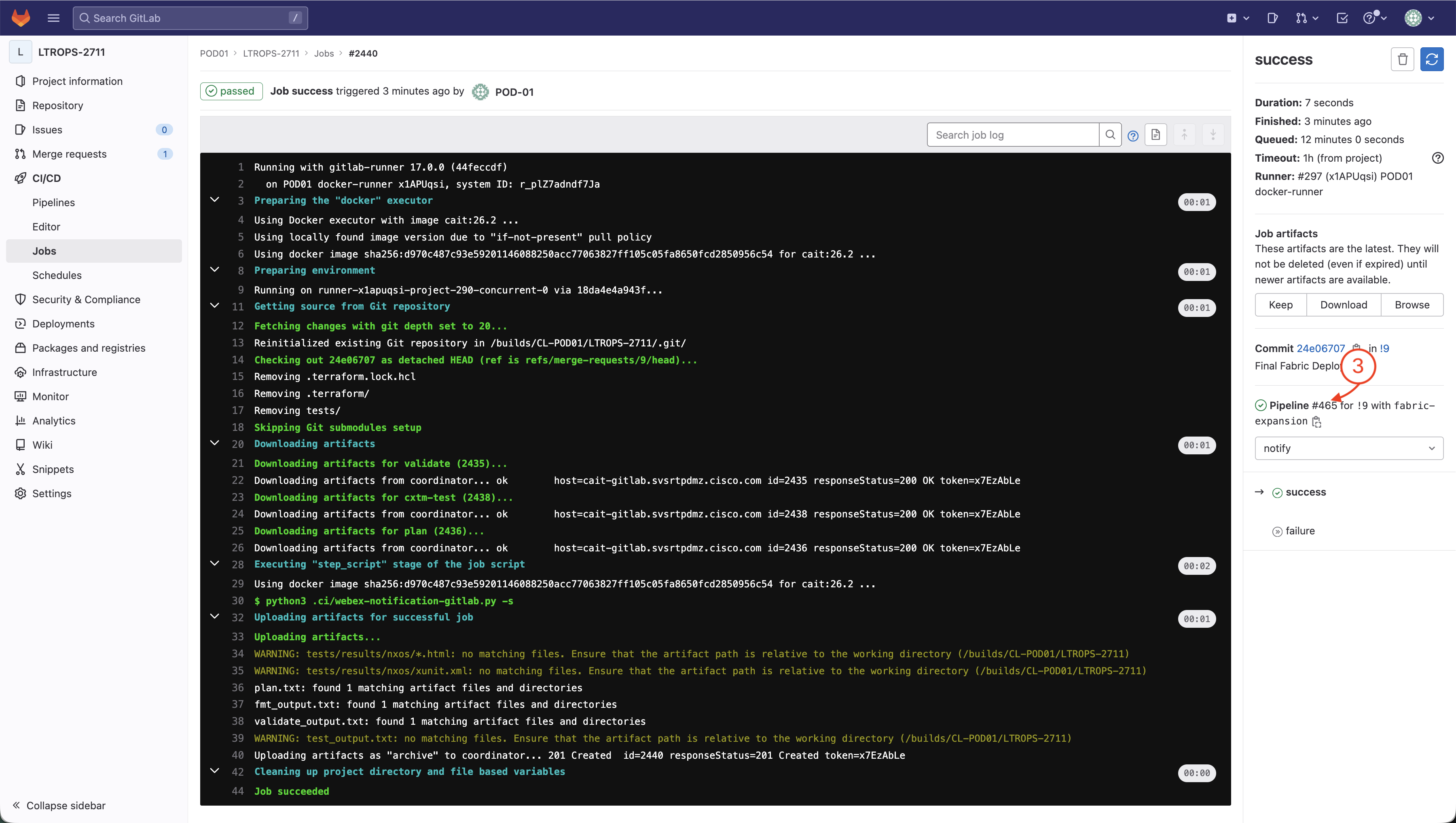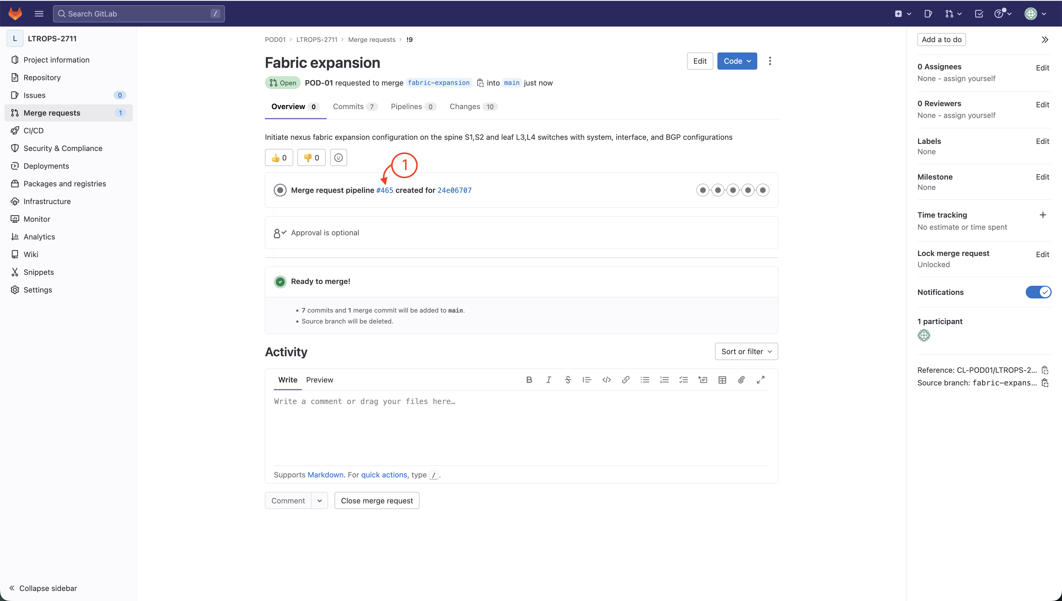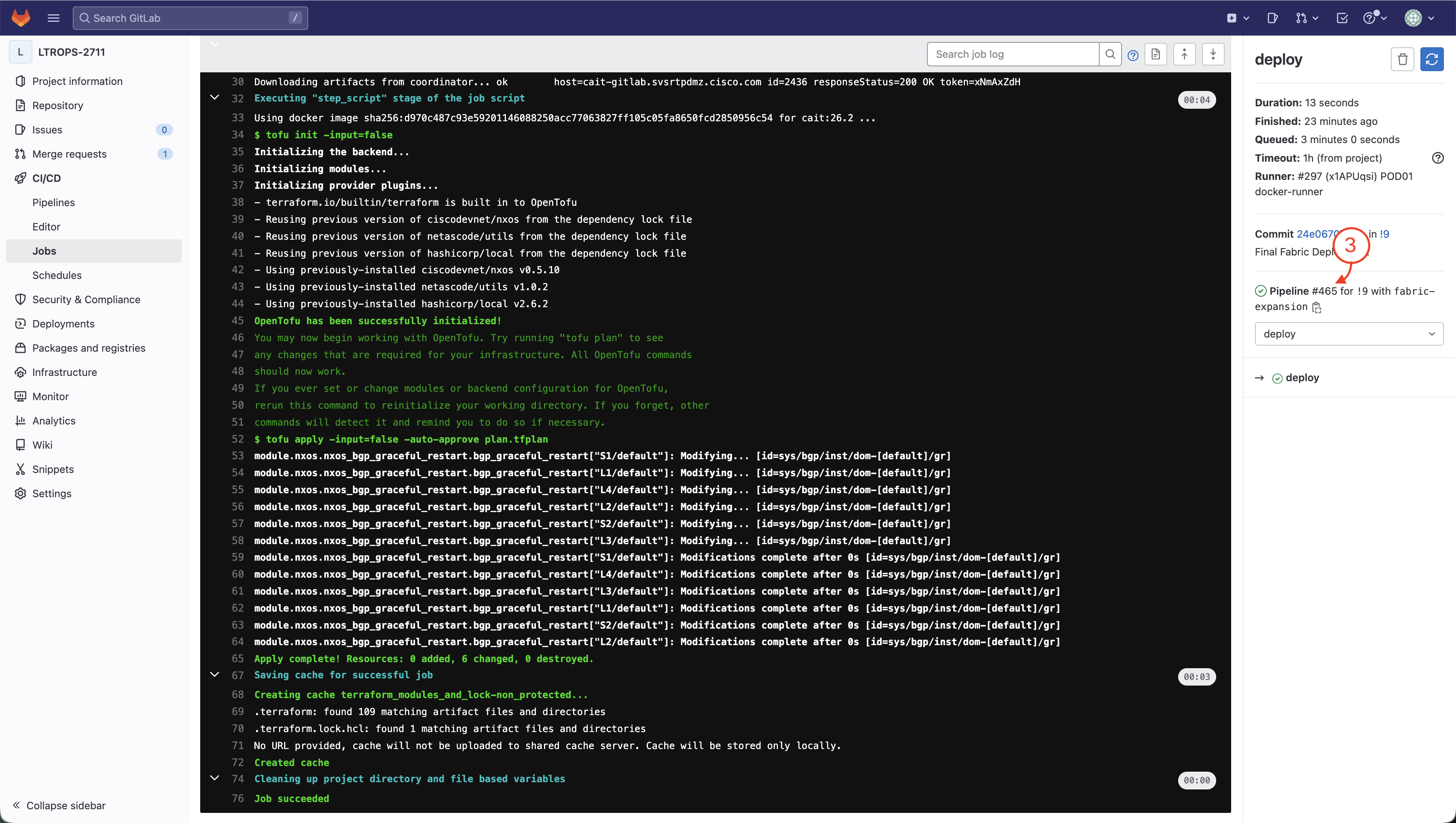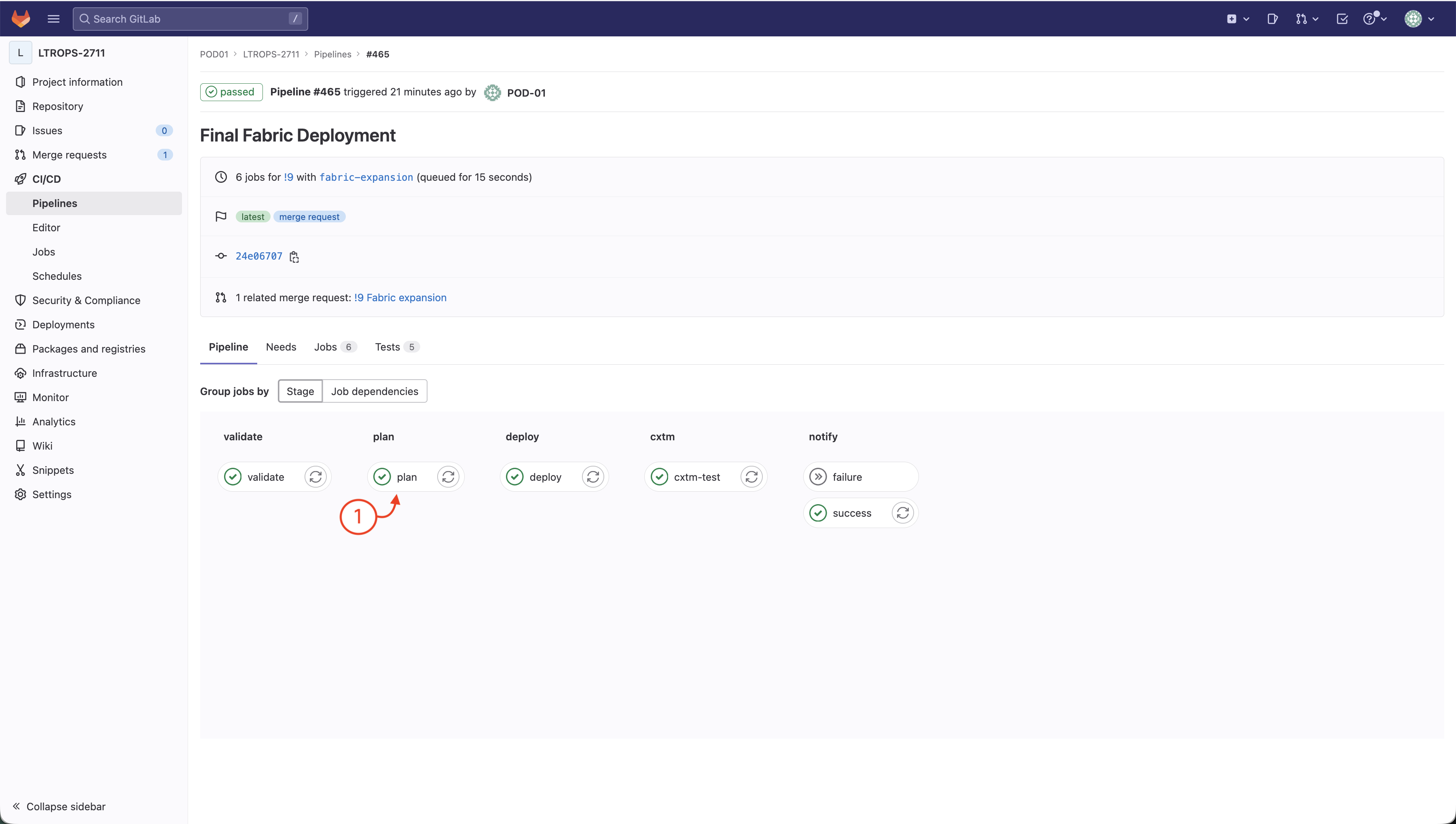 In this section, you will execute the complete GitLab CI/CD pipeline with all stages including validation, planning, deployment, testing, and notifications to deploy the expanded Nexus fabric configuration.