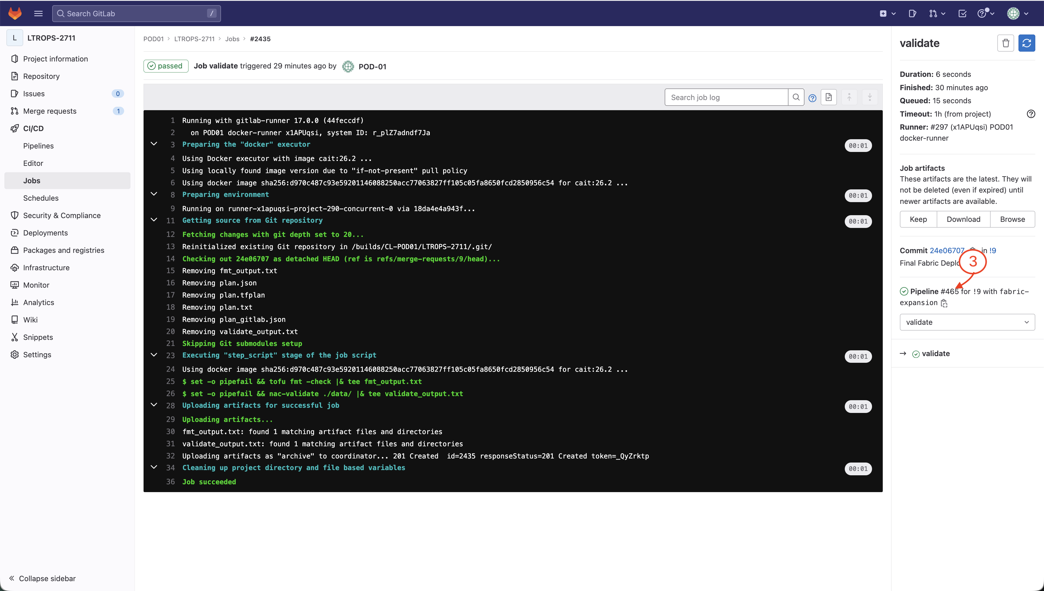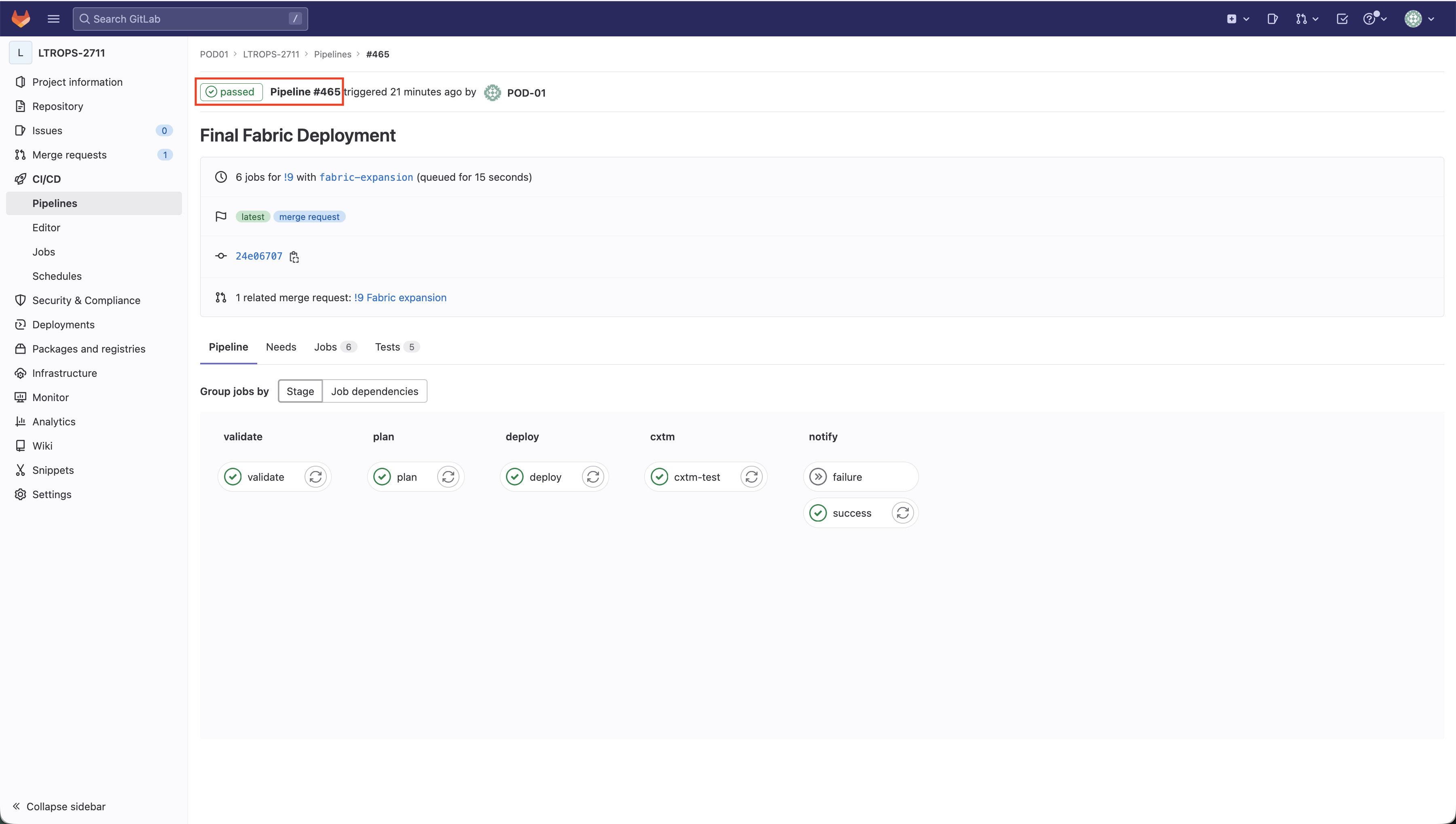 At this point, you should have successfully triggered the CI pipeline for your proposed fabric expansion deployment configuration. The screenshots below show a completed and Passed pipeline. If your own pipeline is still running, please wait until all your pipeline stages have completed before proceeding.