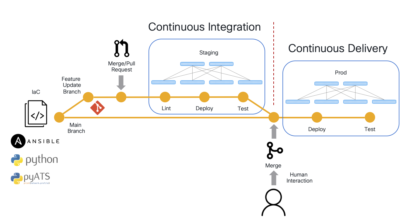 Upon the successful execution of this pipeline, your configuration change branch is ready to be merged to your main branch. Doing this is outside the scope of this lab as this action, in reality, could perform one of two things: 1) Continuous Delivery (CD) where the pipeline is waiting on you to manually perform that merge through a merge or pull request process to in turn make and test the configuration changes to your production network (i.e. during a scheduled change or maintenance window), or 2) Continuous Deployment (also CD) where the pipeline would not wait for your interaction but instead, upon success of the configuration change and testing against your test network, automatically roll out the changes (and testing) to your production network.