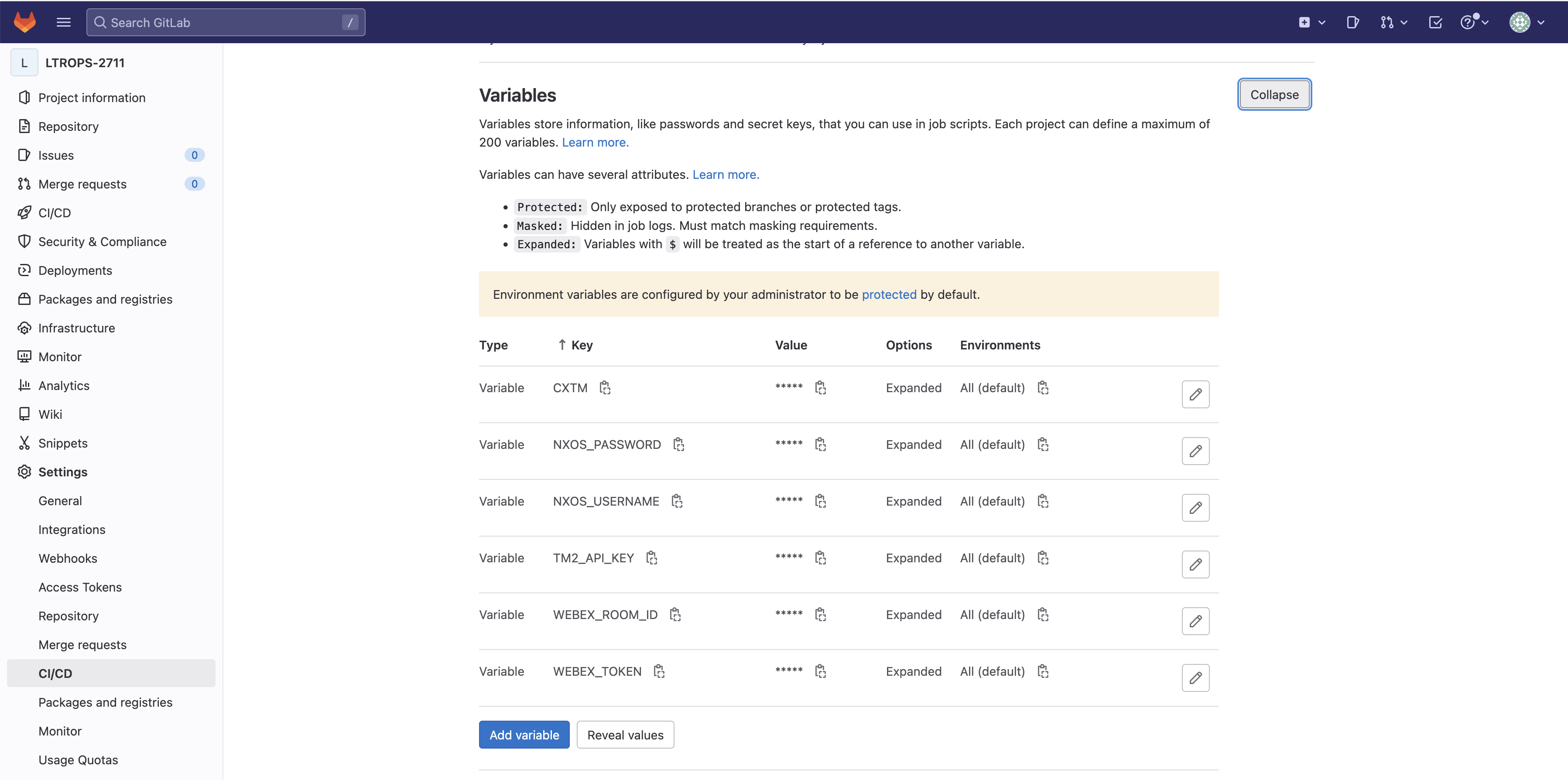 For this lab, the initially required pipeline variables have already been created and populated in your GitLab project's CI/CD settings. Let's navigate to view these pre-configured variables by returning to your GitLab browser window and accessing the CI/CD settings.